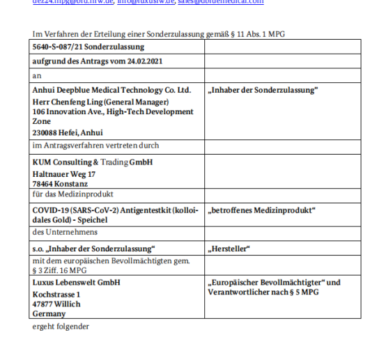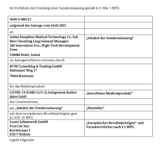 2021年4月15日,安徽深藍(lán)醫(yī)療科技股份有限公司自主研發(fā)的COVID-19 (SARS-CoV-2) Antigen test (kolloidales Gold)及COVID-19 (SARS-CoV-2) Antigen test kit (kolloidales Gold) - Speichel 獲得德國(guó)BfarM特殊授權(quán),深藍(lán)醫(yī)療是安徽省目前首家通過德國(guó)BfarM特殊授權(quán)的企業(yè)。