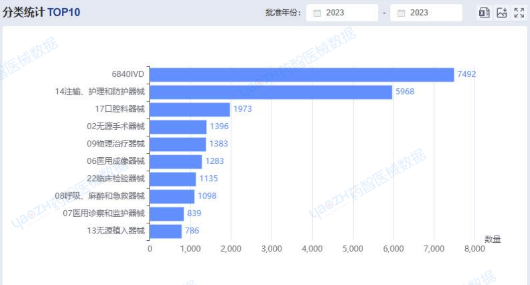 從產(chǎn)品類別來看,2023年全國注冊醫(yī)療器械產(chǎn)品中,體外診斷試劑(7492件),注輸、護理和防護器械(5968件)及口腔科器械(1973件)注冊數(shù)量位列前三。