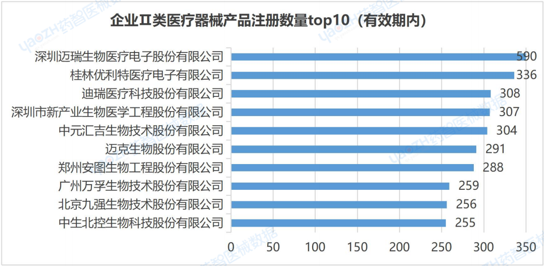 從企業(yè)注冊數(shù)量來看,截至2024年2月,在有效期內(nèi)全國共有19234家企業(yè)注冊Ⅱ類醫(yī)療器械產(chǎn)品,注冊數(shù)量排名第一的企業(yè)是深圳邁瑞生物醫(yī)療電子股份有限公司,產(chǎn)品注冊數(shù)為590件。