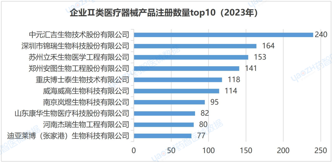 其中,2023年全國共有7073家企業(yè)注冊Ⅱ類醫(yī)療器械產(chǎn)品,注冊數(shù)量排名第一的企業(yè)是中元匯吉生物技術(shù)股份有限公司,產(chǎn)品注冊數(shù)為240件。