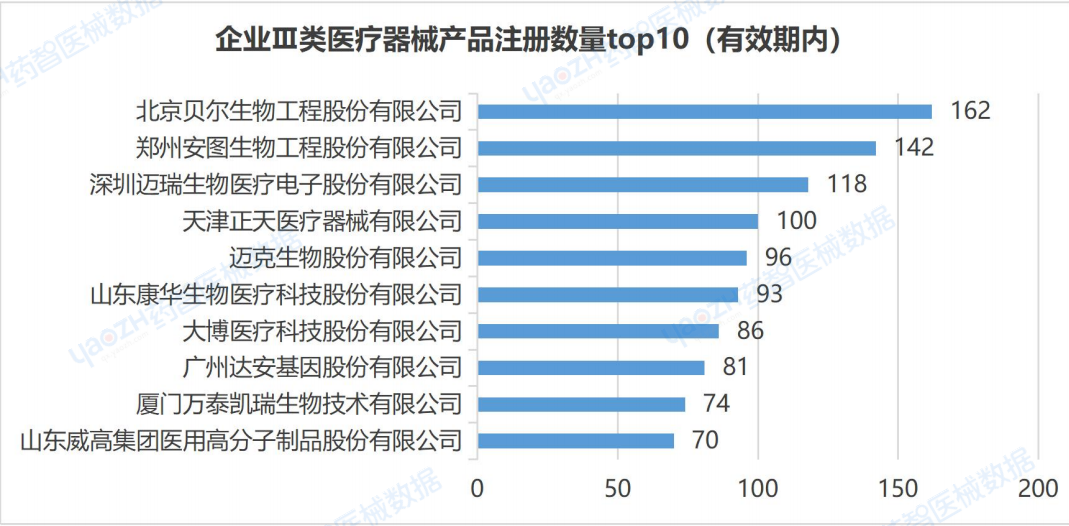 從企業(yè)注冊數(shù)量來看,截至2024年2月,在有效期內(nèi)全國共有3048家企業(yè)注冊Ⅲ類醫(yī)療器械產(chǎn)品,注冊數(shù)量排名第一的企業(yè)是北京貝爾生物工程股份有限公司,產(chǎn)品注冊數(shù)為162件。