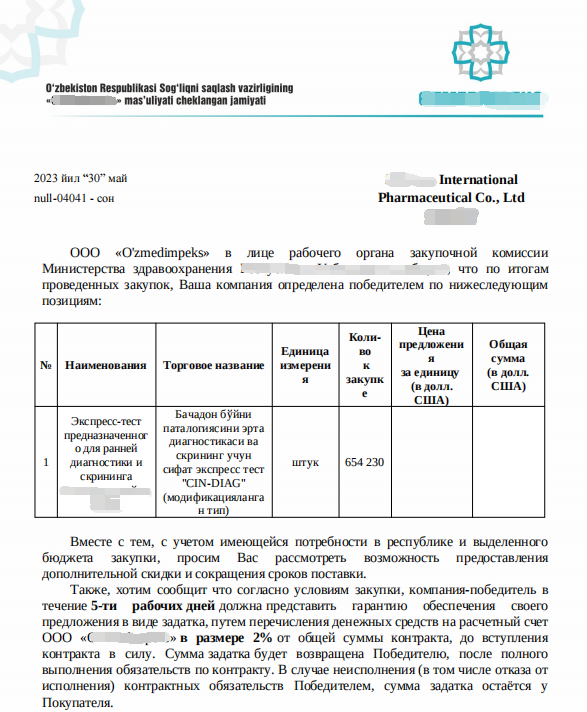 2023年6月,深藍(lán)醫(yī)療的上皮組織染色液產(chǎn)品在烏茲別克斯坦獲得政府標(biāo)單,首批數(shù)量65萬人份。MU LIN SEN公司作為深藍(lán)醫(yī)療重要的戰(zhàn)略合作伙伴,長期致力于本地銷售和宣傳深藍(lán)醫(yī)療的優(yōu)質(zhì)產(chǎn)品。此次中標(biāo),正是基于雙方的深度合作以及深藍(lán)醫(yī)療產(chǎn)品在當(dāng)?shù)厥袌龅牧己每诒?,也是對雙方團(tuán)隊(duì)的高度肯定,令人深受鼓舞。