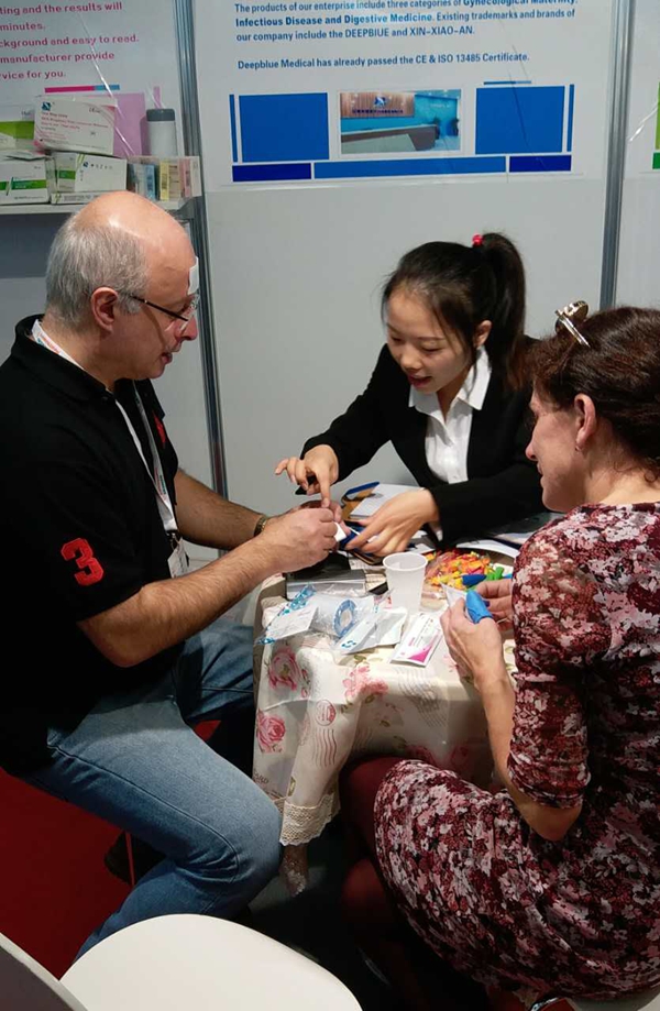 ??2018年11月12日至15日,2018年德國杜塞爾多夫國際醫(yī)療器械及設(shè)備展覽會(huì)(MEDICA2018)順利舉行,來自世界76個(gè)國家的4200家醫(yī)療公司參加了本次展會(huì)。安徽深藍(lán)醫(yī)療科技股份有限公司外貿(mào)部攜公司CE認(rèn)證產(chǎn)品首次亮相,即得到了各國客戶的青睞,前來參觀和咨詢的各國采購商和專業(yè)觀眾絡(luò)繹不絕。在為期四天的展覽會(huì)上,深藍(lán)醫(yī)療展位吸引了眾多外商駐足,我司外貿(mào)人員始終以飽滿的熱情、耐心地與各國客戶進(jìn)行溝通交流,共接待各國客戶近百人,本次展會(huì)不僅在國際舞臺(tái)上宣傳了公司產(chǎn)品,也加快了公司產(chǎn)品與國際的接軌。