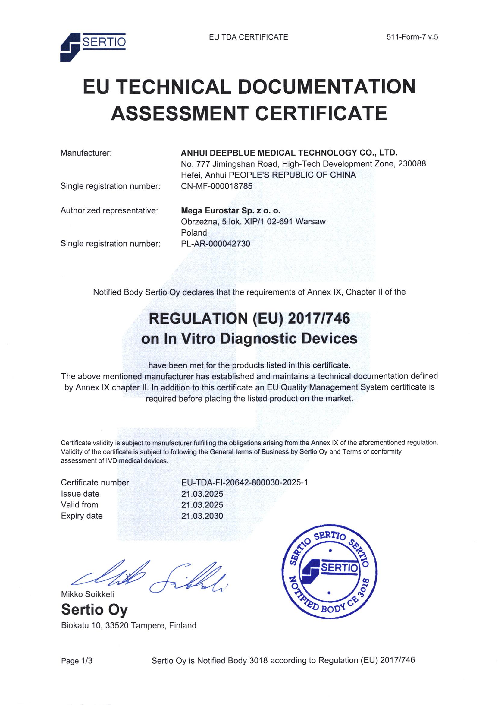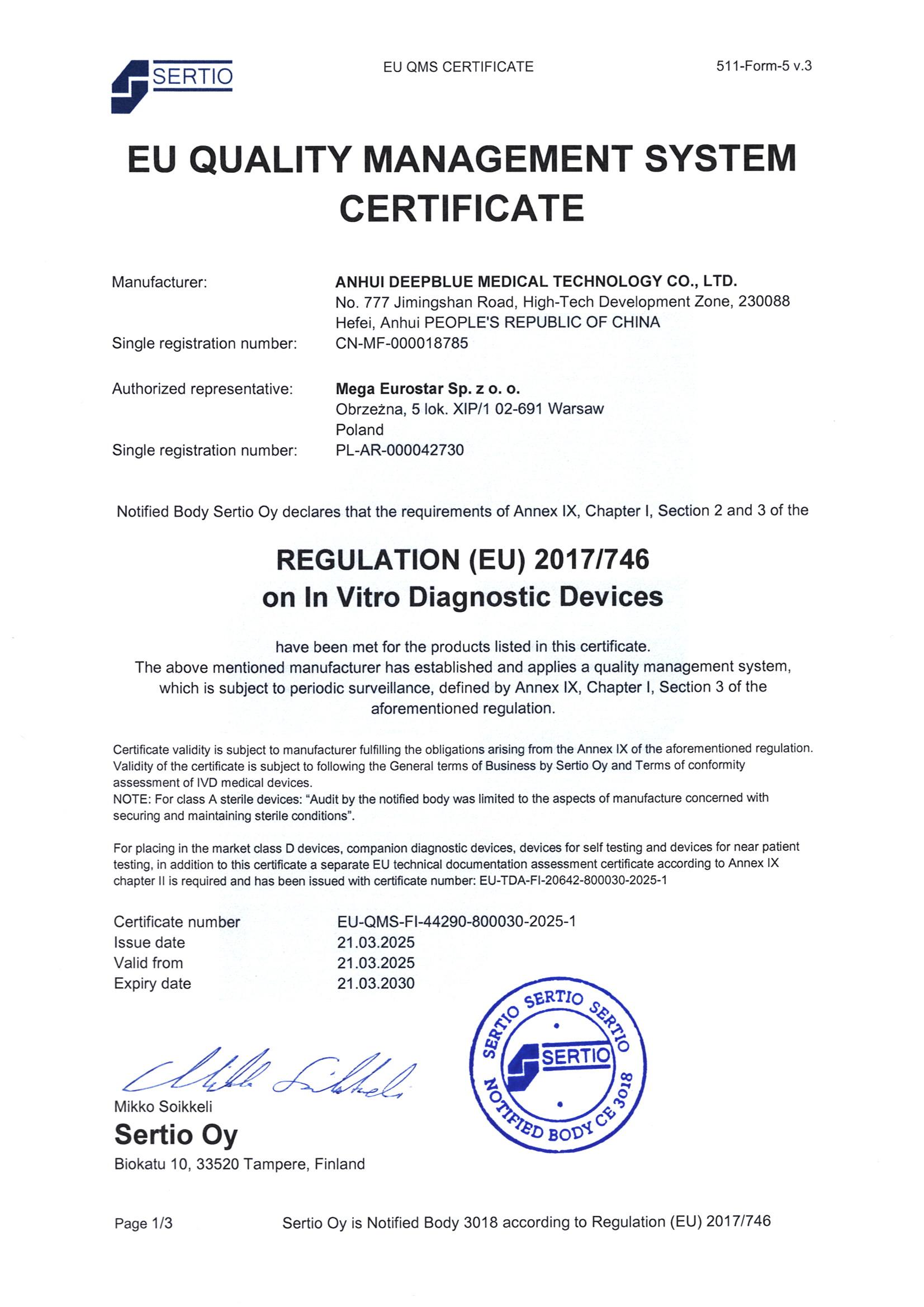 2025年3月22日,安徽深藍(lán)醫(yī)療科技股份有限公司(以下簡稱“深藍(lán)醫(yī)療”)自主研發(fā)的呼吸道五合一自測試劑盒正式通過波蘭公告機(jī)構(gòu)NB 3018的嚴(yán)格審核,獲頒3018質(zhì)量管理體系認(rèn)證證書和歐盟CE產(chǎn)品認(rèn)證證書,這是深藍(lán)醫(yī)療在國際化進(jìn)程中取得的又一里程碑。