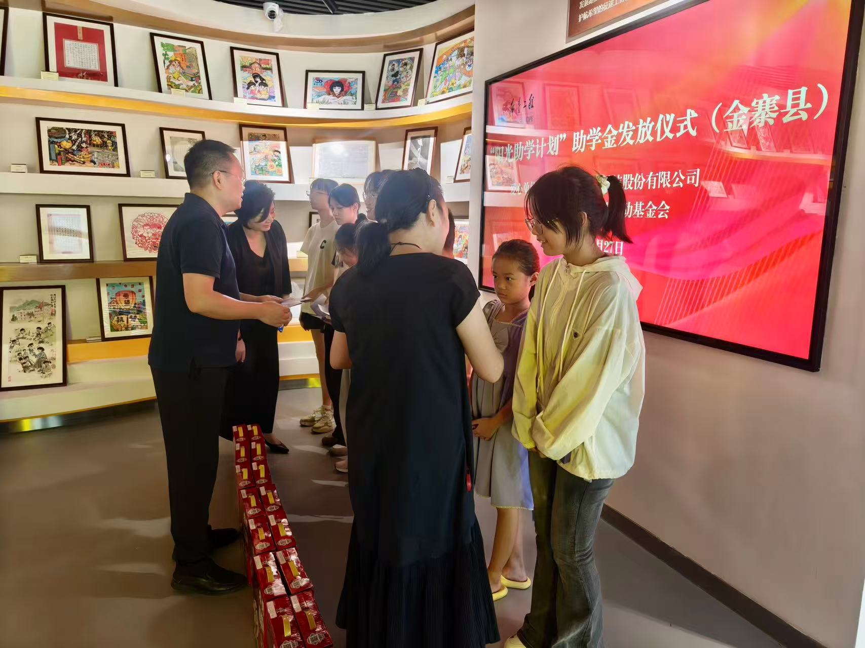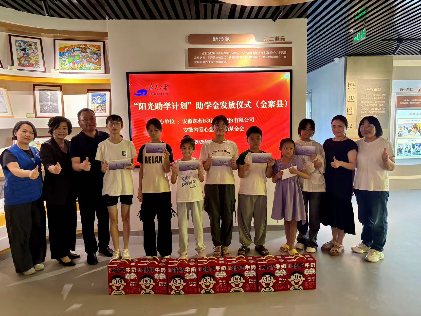 隨后,其余受助學生齊聚金寨縣希望工程展示館,參加了簡樸而隆重的集中捐贈儀式。公司兩位代表將助學金逐一發(fā)放到學子手中,這不僅是一份物質(zhì)的資助,更是一份精神的期許,寄托著深藍醫(yī)療對孩子們美好未來的殷切祝愿。